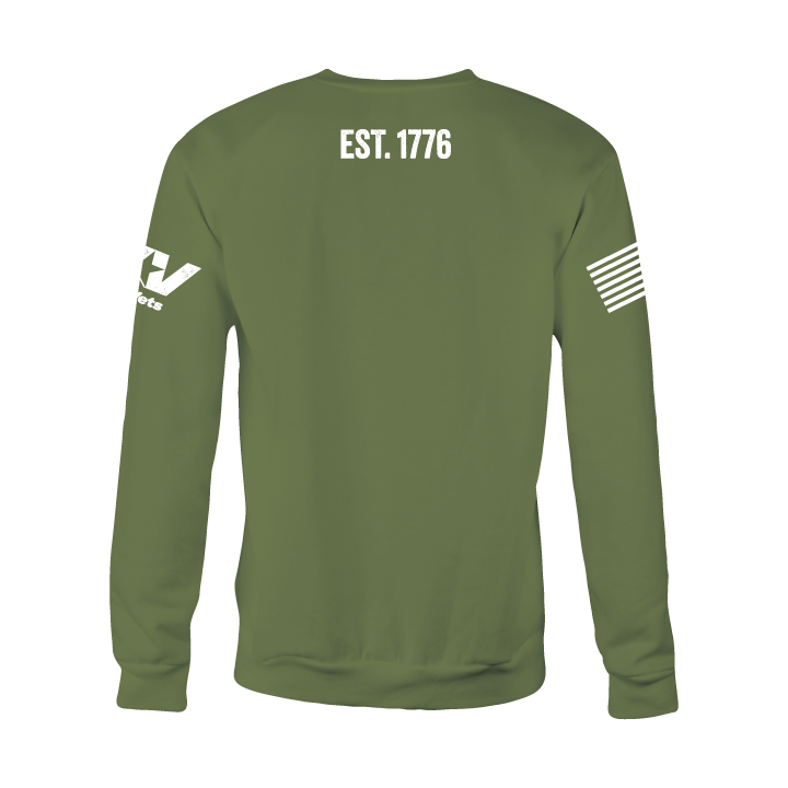 "250 Still No Kings" front imprint with "American Flag" and "VoteVets Logo" sleeves. "Est. 1776" back imprint. Imprint on Olive, 80/20 cotton-poly blend crewneck sweater.