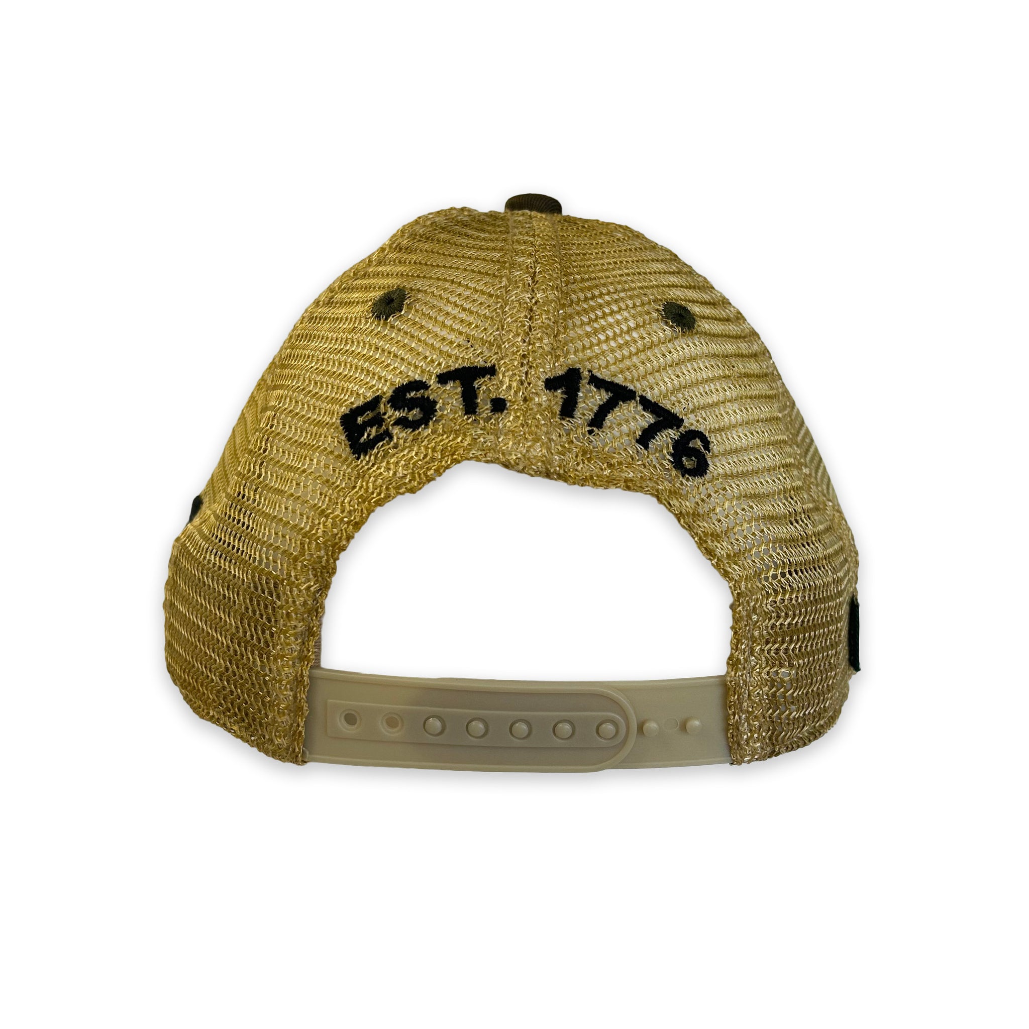 VoteVets Logo, American Flag, and Est. 1776 embroidered patches on a Olive unstructured trucker cap with size-adjustable snapback closure and curved bill.